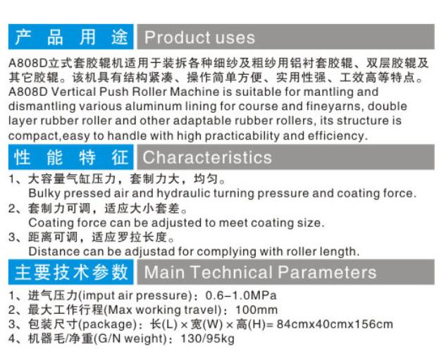 A808Q汽動套皮輥機(jī)本機(jī)特點: 適用于粗、細(xì)紗膠輥、鋁襯膠輥、雙層膠輥的套制和剝離。采用壓縮空氣,杜絕了皮輥油污,清潔節(jié)能.(1)采用氣動控制 氣源壓力:0.6-0.7Mpa。(2)***大工程行程:70mm。(3) 凈重:105Kg(4) 外形尺寸:900mm×580mm×1740mm